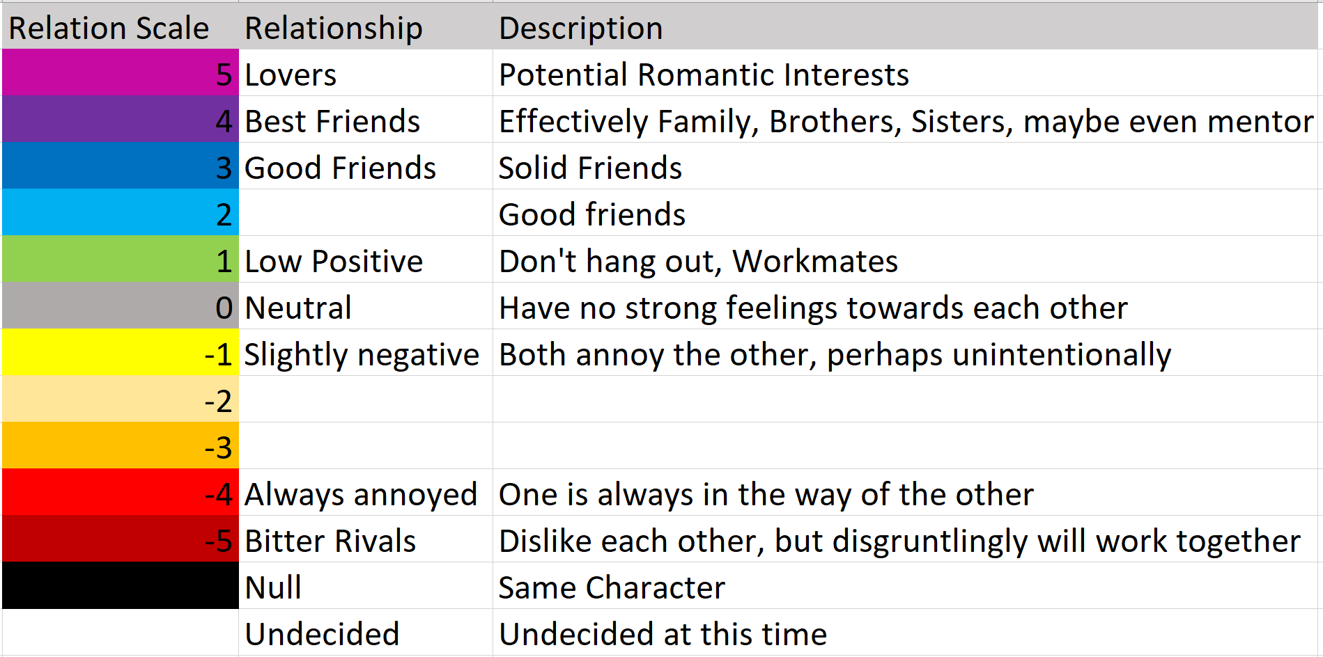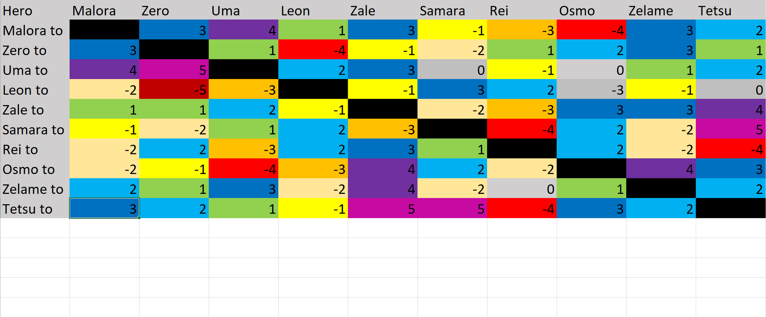 After the initial set up was complete, I took a look at each of our heroes, including the ones we had yet to really develop yet, and tried two expand upon them in as many ways as possible. And while many of my ideas were far too big for something like a mobile title to hold, take a look at the relationship matrix and key I developed, I ultimately had to cut my ideas down pretty heavily. The two major constraints I was working with came to my director wanting to keep the narrative moments in, but not having them disrupt gameplay in a significant way and I only had about 160 characters to work with on each dialogue screen, so narrative and character moments had to be short and concise.