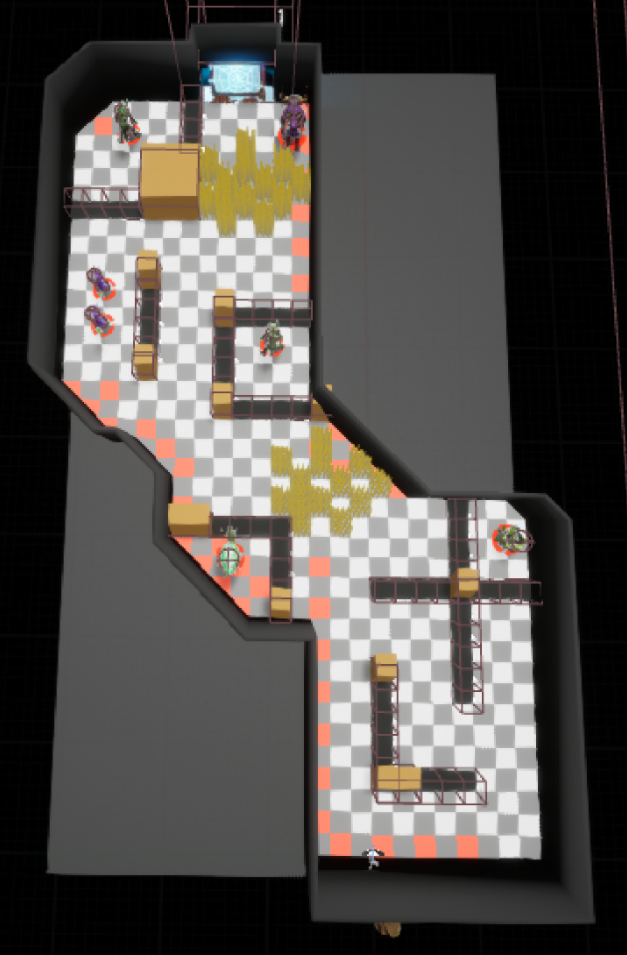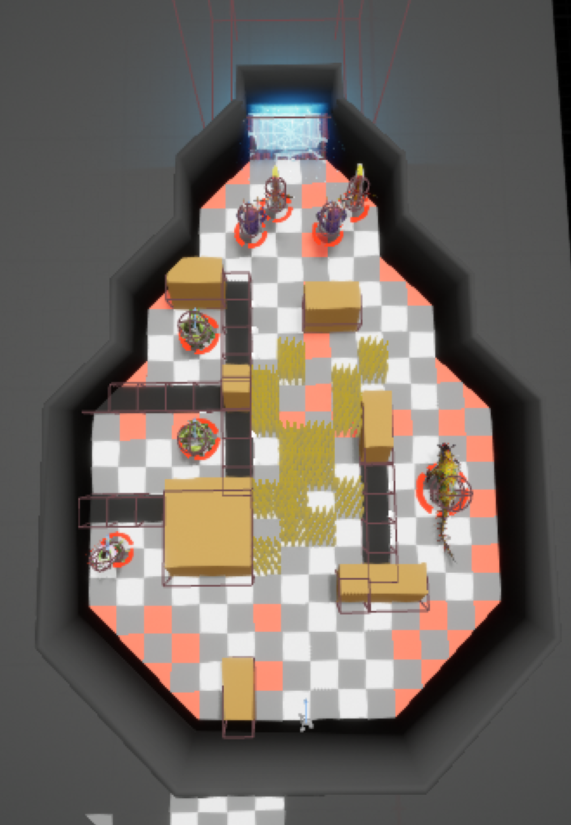 Working alongside a very talented technical artist we were able to create a tool that expedited our room creation process. We started by creating a series of basic shapes of varying sizes. This allowed us create and populate rooms with different floors and shapes, letting what shapes worked well with our camera and with our enemies. Then the technical artist developed a tool to read the floors and generate a wall around the exterior of the floor, eliminating the need to build the walls for the level by hand, which was a real time saver. This plus a few updates and fixes allowed us to crack out rooms and explore exciting new spaces for our levels so we could continue to challenge players.