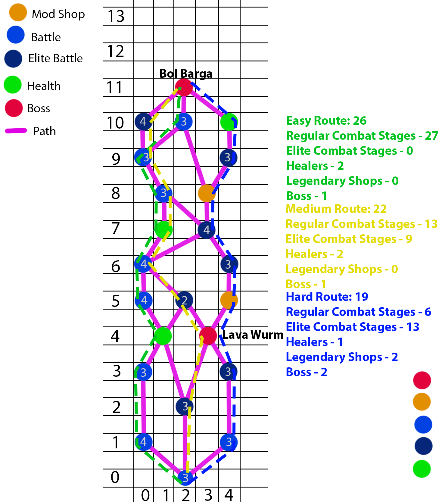 As the project went on, we wanted to find ways to excite players and give them more choice in what challenges they wanted to take on while also increasing playability. As such, the team settled on what we referred to as Chapter Map. Essentially players would start at the bottom of a chapter map and slowly work their way up choosing a route of nodes. Each node had a collection of levels based around a theme or enemy. So, one route might have more flying enemies, one route might have more melee enemies, and a third might have an equal mix of the two.
